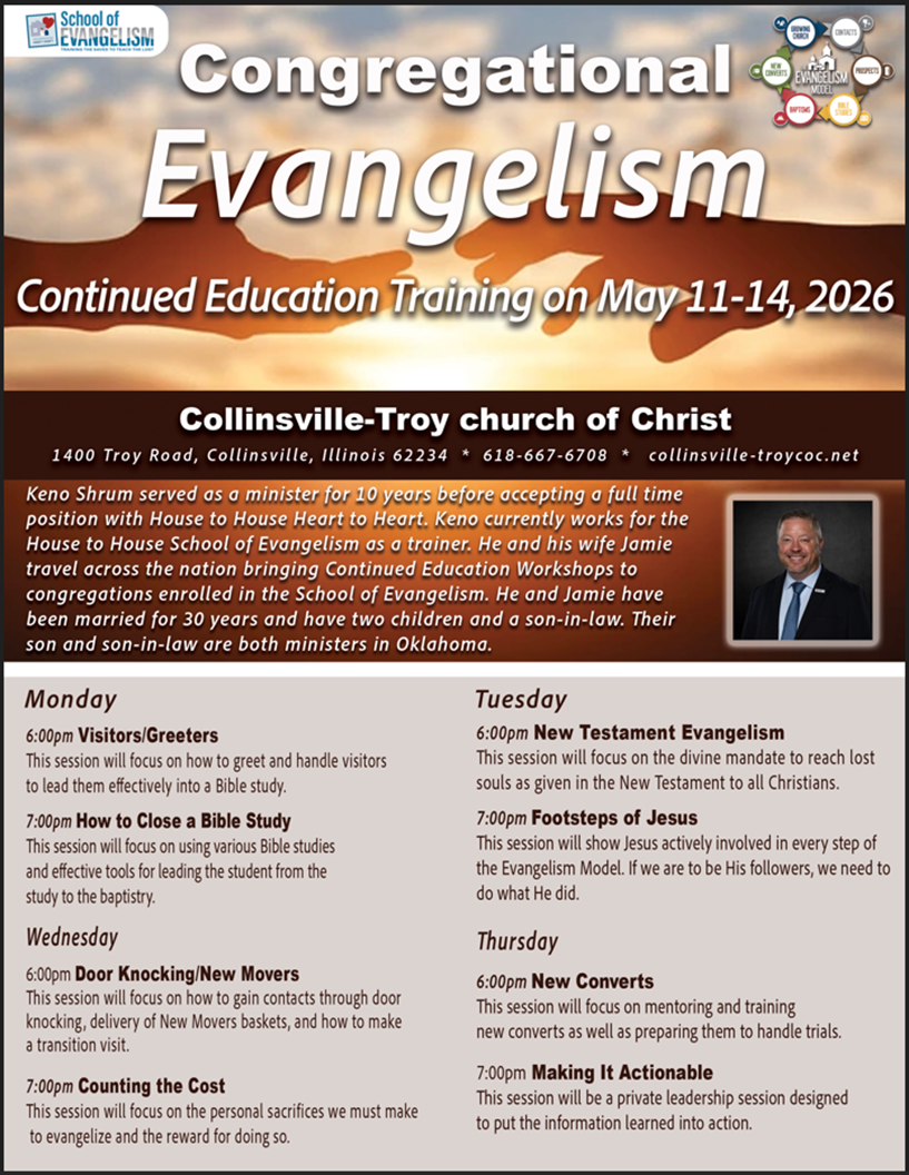 Just off Interstate 55/70 at Exit 17 in Troy, Ilinois, is a nondenominational congregation of Christians who base their worship, service, and life on the principles found in the Holy Bible. We follow no creed but Christ, no manual but the Bible, and no spiritual authority but God. When you visit you will not participate in an entertainment-oriented exercise, but in a God-centered worship patterned after the truth and simplicity of New Testament worship (John 4:23). We strive to follow Paul's instruction, "And whatsoever ye do, in word or in deed, do all in the name of the Lord Jesus, giving thanks to God the Father through him" (Colossians 3:17).